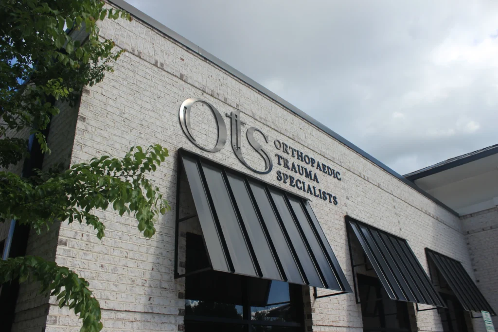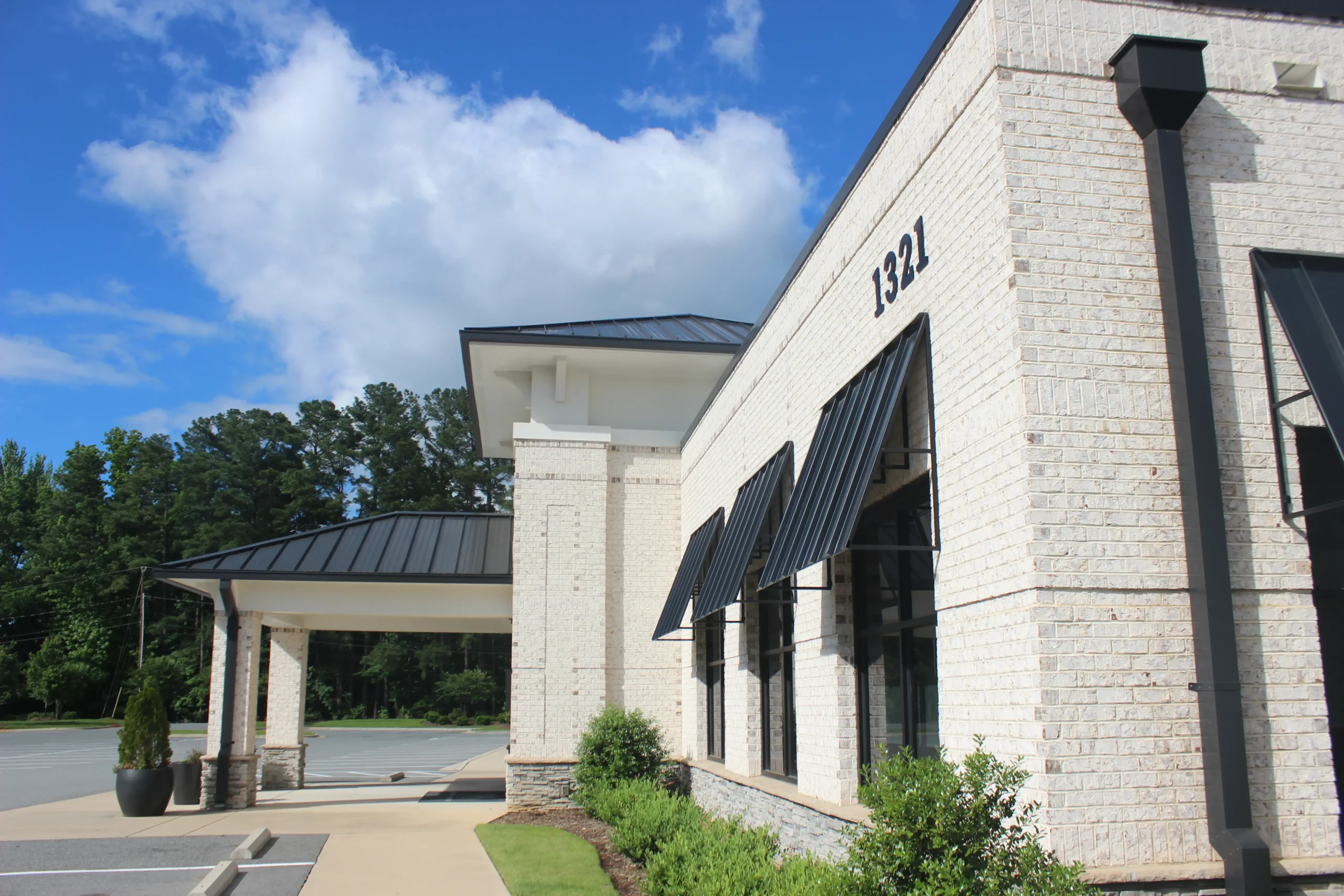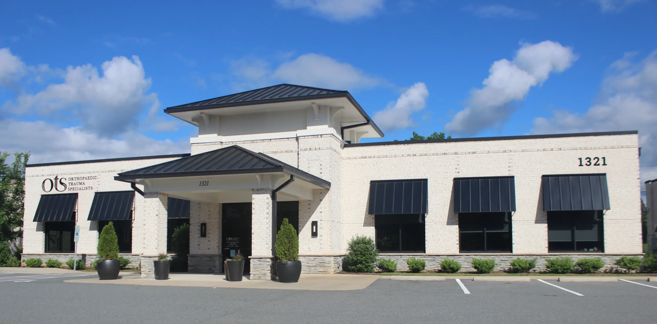 The Orthopaedic Trauma Specialists office at 1321 New Garden Road, Greensboro, North Carolina, is a single-story medical office designed to harmonize with its neighboring Guilford Eye Center while addressing the specific needs of orthopedic care. The building features a hip roof, brick-and-stone pilasters, and detailed brickwork with soldier and corbelled courses. Large windows in exam rooms enhance natural light for patient consultations and recovery. Interiors prioritize efficient patient flow, modern functionality, and accessibility. Strategically designed, the facility balances professional elegance, patient-centered care, and cohesive integration within the New Garden Road medical corridor.